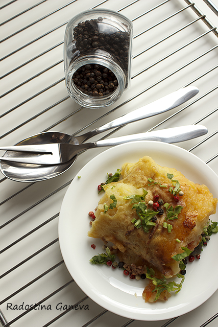 Когато сте готови с нанасянето на картофеното пюре върху телешкото пъхнете във фурна загрята на 200˚С и запечете за около 30 мин.
